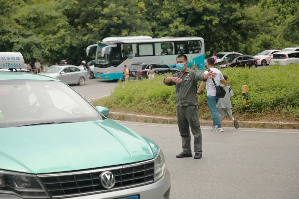在每天的游客入園高峰時期,各種旅游大巴車、自駕車源源不斷的駛?cè)胍跋蠊葍?nèi),造成道路擁擠。為確保游客能安全、有序、快速的進(jìn)入園區(qū),野象谷黨員干部沖鋒在前,帶頭在烈日下指揮車輛有序停放,確保交通順暢。